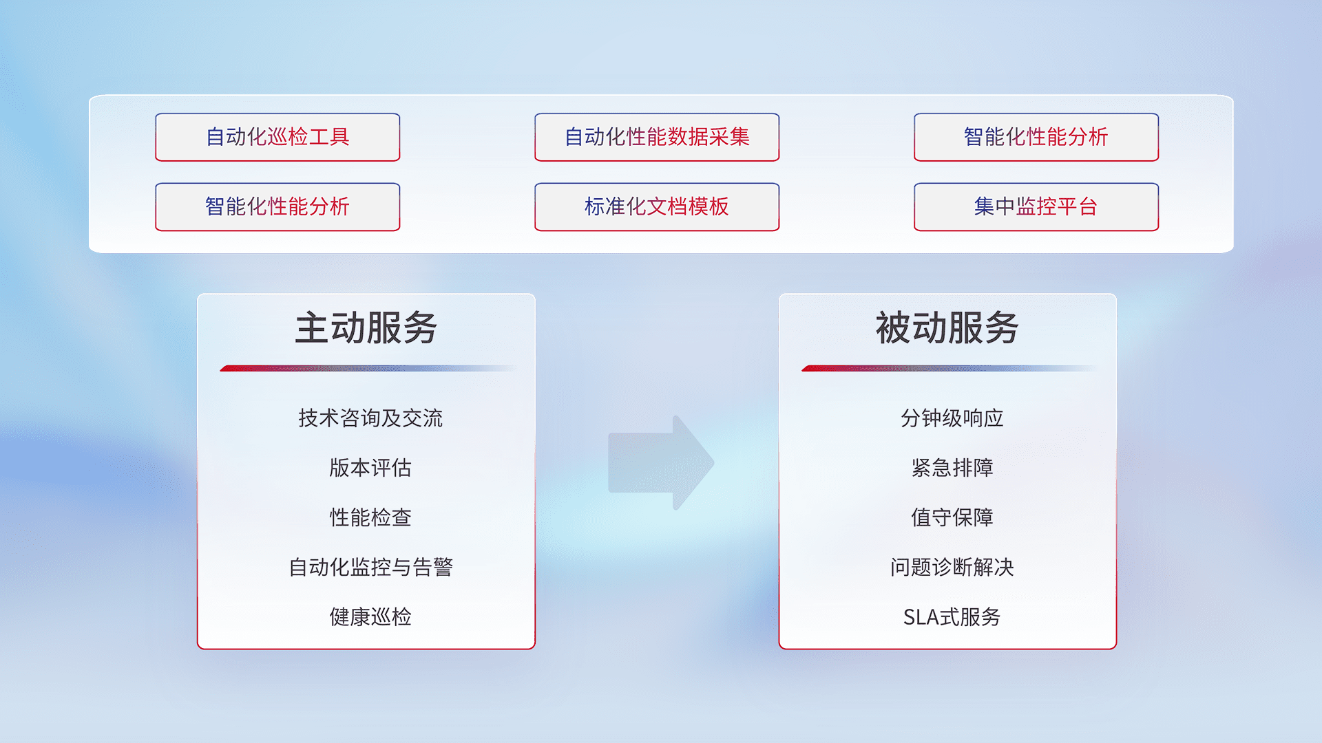 智能化工具和标准化文档,,,,保障服务质量,,,,提供主动服务(包含技术咨询、、、版本评估、、、、性能检查、、自动化监控与告警、、、健康巡检)和被动服务包含(分钟级响应、、、、紧急排障、、值守保障、、、、问题诊断解决、、SLA服务)。。。。